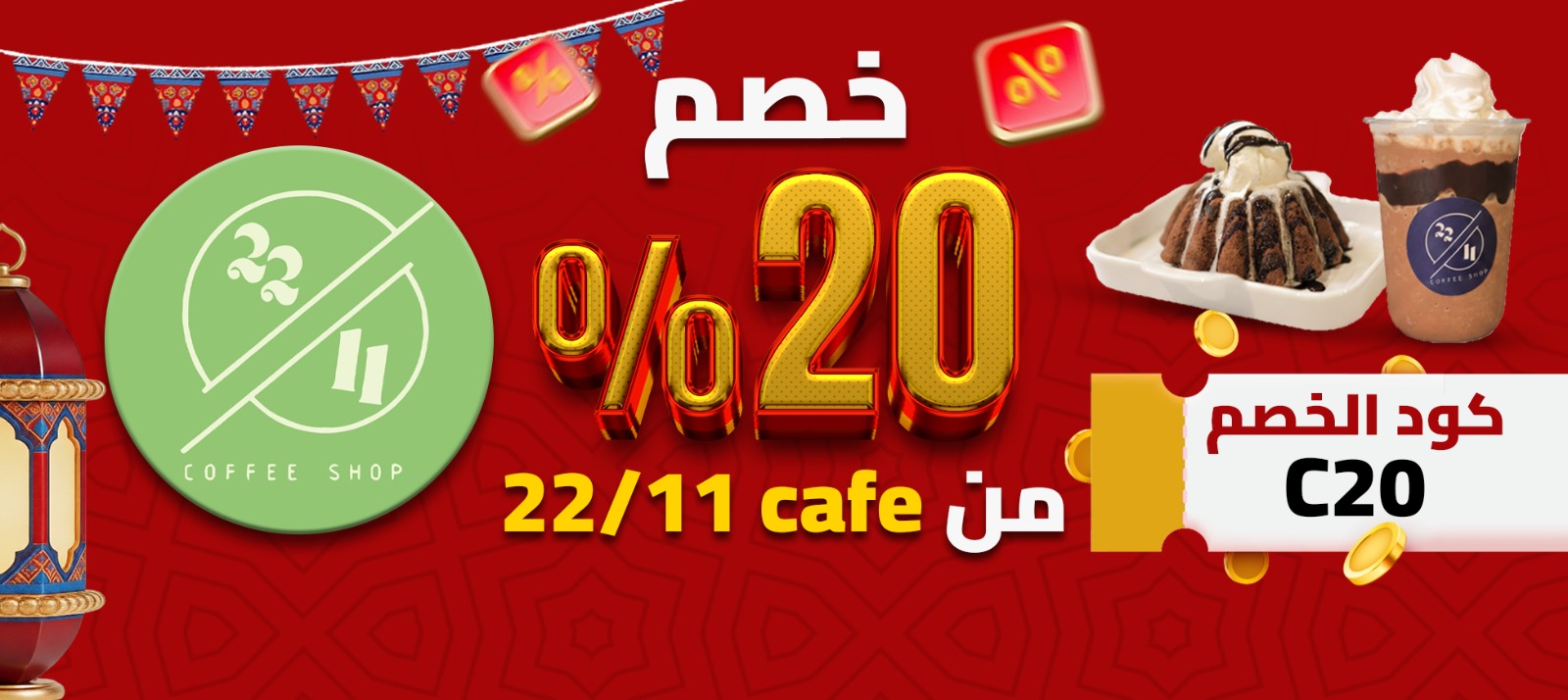 خصم 20% على منيو #22_11 🎉 وكمان عرض لمحبيين الحلويات 😋 هتاخد الخصم لما تستخدم كود C20🎁 والعرض 3 درينك معاهم ديزرت من اختيارك✨ يومك محتاج حاجة حلوة ؟ 🍰 ولا مشروب ينعش مزاجك ☕ اطلب دلوقتي وخلي يومك احلي 🤩