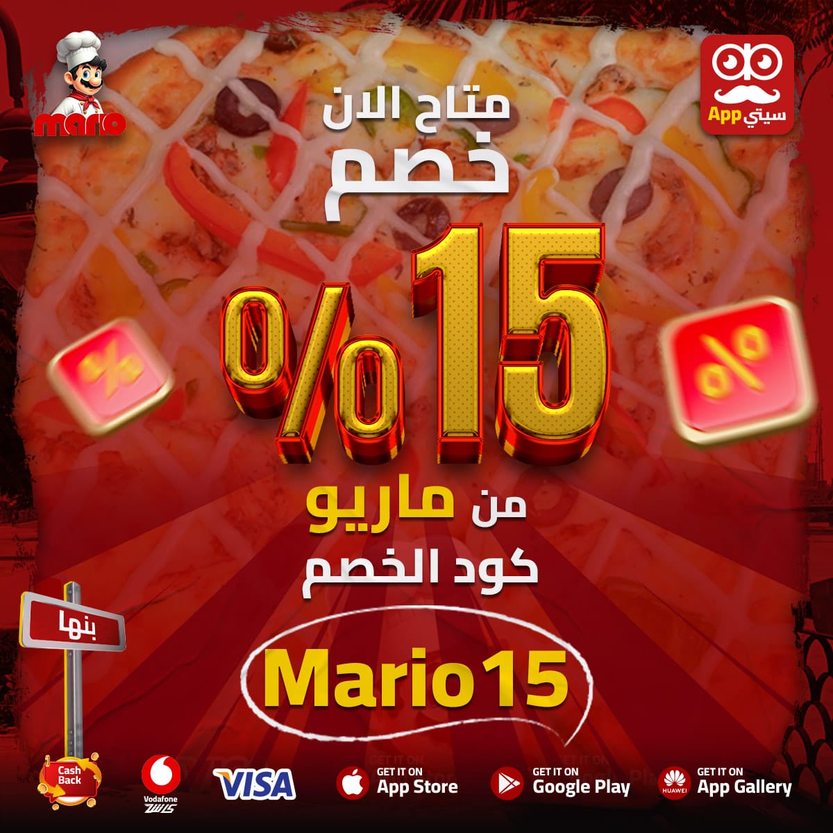 خصم 15% على المنيو كله من مطعم #ماريو 🔥🔥 لما تستخدم كود *Mario15* 👌🏻 بيتزا ، سندوتشات ، وجبات ، باستا ،شوربة مع جارلك بريد او عيش محمص بالزبدة والليمون ، مكسيكان ، تاكو .....🍕🌮🥘😋
