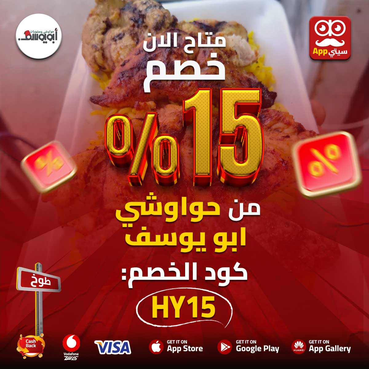 #خصم 15% من #حواوشي_أبو_يوسف 😍 على المنيو كله فى #طوخ على ابلكيشن #سيتي_اب 📱💎 لما تستخدم كود الخصم " HY15 " 🎁 ولسه المفاجآت ما خلصتش 🎉 🆕 فتحنا قسم المشويات الجديد 🥩🔥 🥩 كبده شرائح 🍗 بانيه 🍢 شيش 🥙 كفتة يعني الحكاية مش حواوشي وبس 🫓 اللي نفسك فيه هتلاقيه عندنا 😎 والخصم شغال على الكل 💥