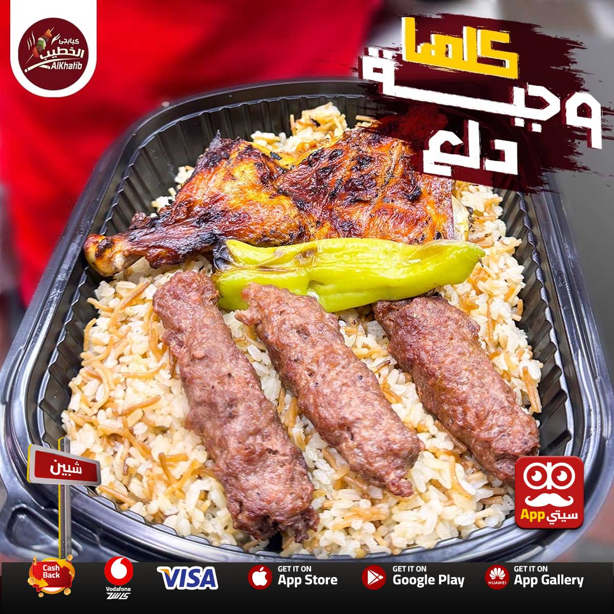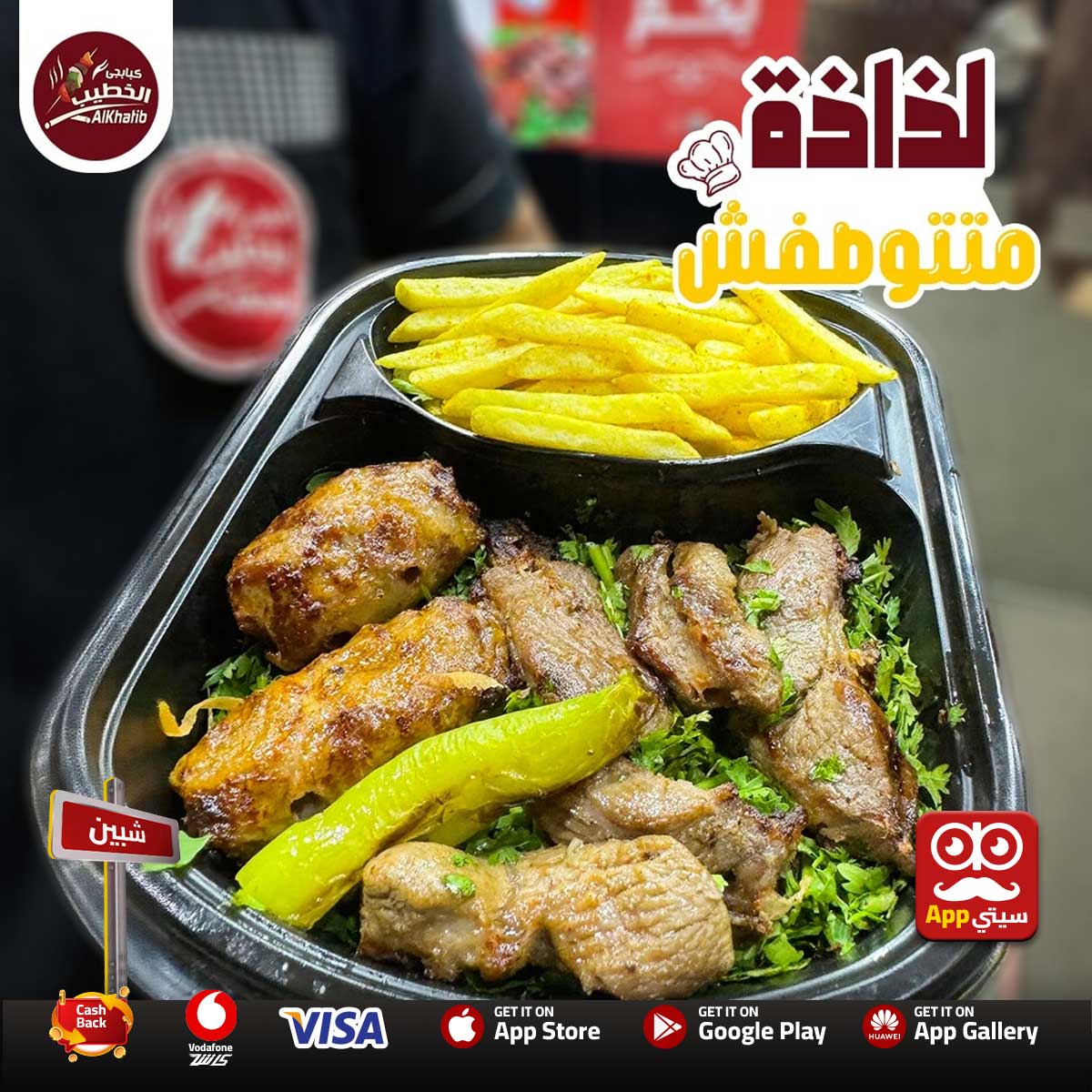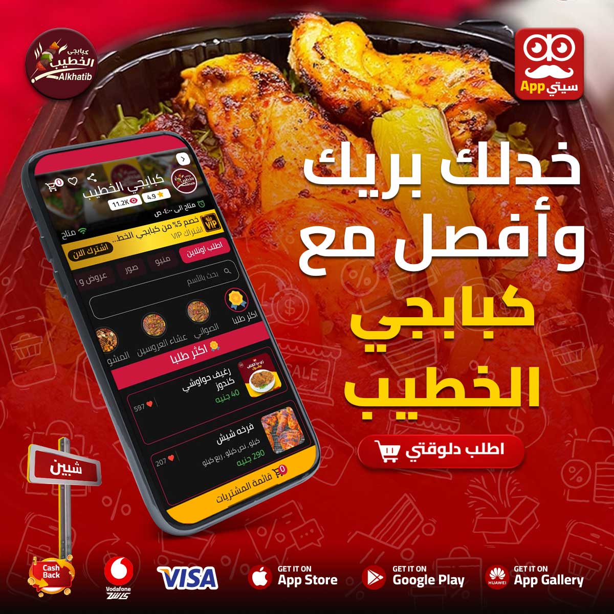 خدلك بريك وأفصل مع #كبابجي_الخطيب في #شبين على ابلكيشن #سيتي_اب 📱💎 🍗 وجبات فردية تشبعك وتظبطك 👨👩👧👦 ووجبات عائلية تكفي أي عدد من أول فرد واحد لحد عزومة كاملة حتى لو مش جعان أوي 🤏 فيه وجبات خفيفة هترضيك المنيو فيه كل اللي نفسك فيه : كباب، كفتة، شيش طاووق، فراخ، حمام، محاشي ومعاهم رز وسلطات تكمل السفرة 💯