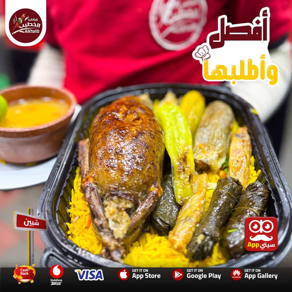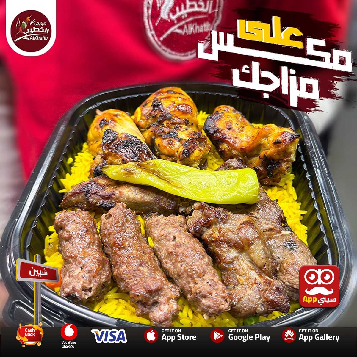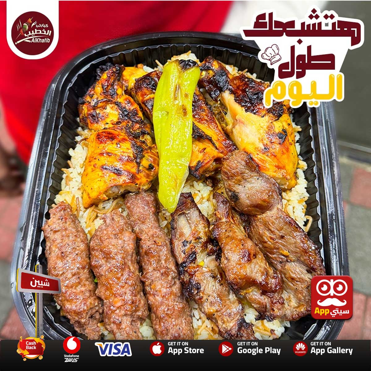 خدلك بريك وأفصل مع #كبابجي_الخطيب في #شبين على ابلكيشن #سيتي_اب 📱💎 🍗 وجبات فردية تشبعك وتظبطك 👨👩👧👦 ووجبات عائلية تكفي أي عدد من أول فرد واحد لحد عزومة كاملة حتى لو مش جعان أوي 🤏 فيه وجبات خفيفة هترضيك المنيو فيه كل اللي نفسك فيه : كباب، كفتة، شيش طاووق، فراخ، حمام، محاشي ومعاهم رز وسلطات تكمل السفرة 💯