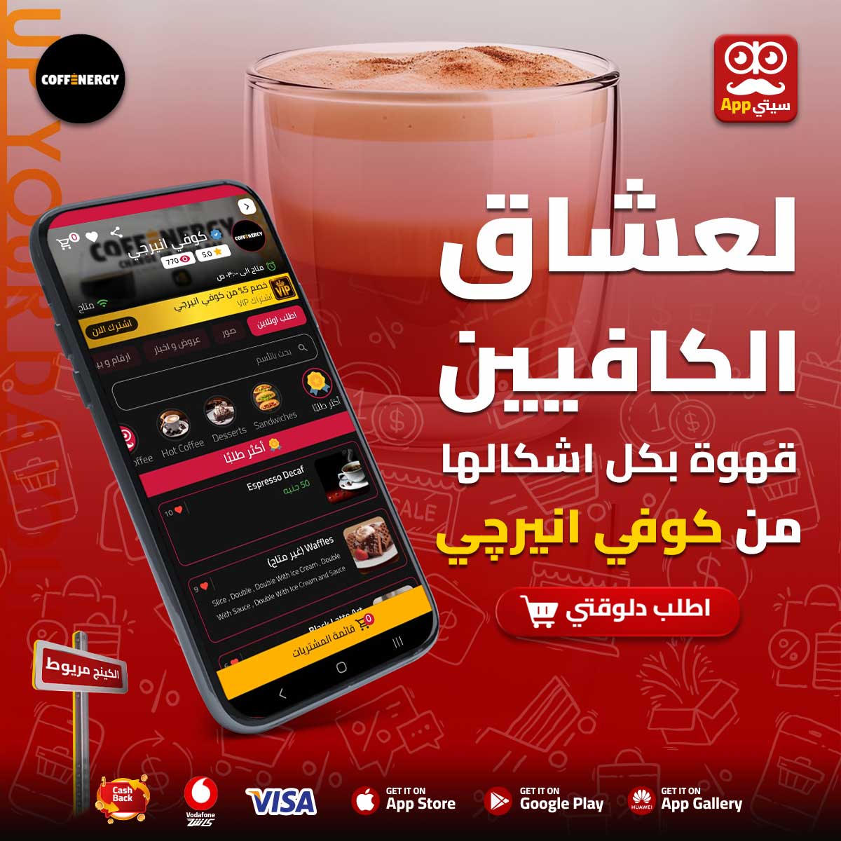 قهوة بكل أشكالها من #كوفي_انيرجي في #كينج_مريوط على أبلكيشن #سيتي_اب 📱 لكل عشاق القهوة 😎 سخنة أو باردة ☕ كلاسيك أو سبشيال🥤 إحنا هنا علشان نظبط مودك في أي وقت من اليوم 💥☕ كمل يومك بحيوية ونشاط مع طعم القهوة اللي هيشحنك طاقة ع الآخر ⚡