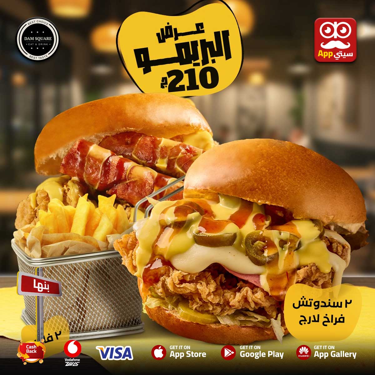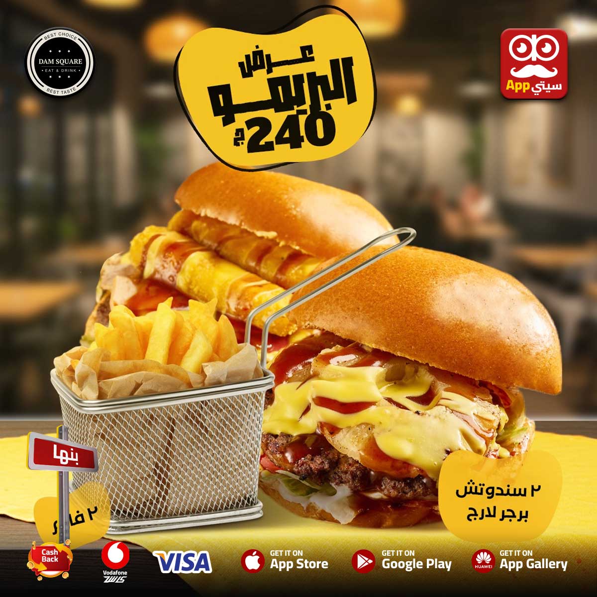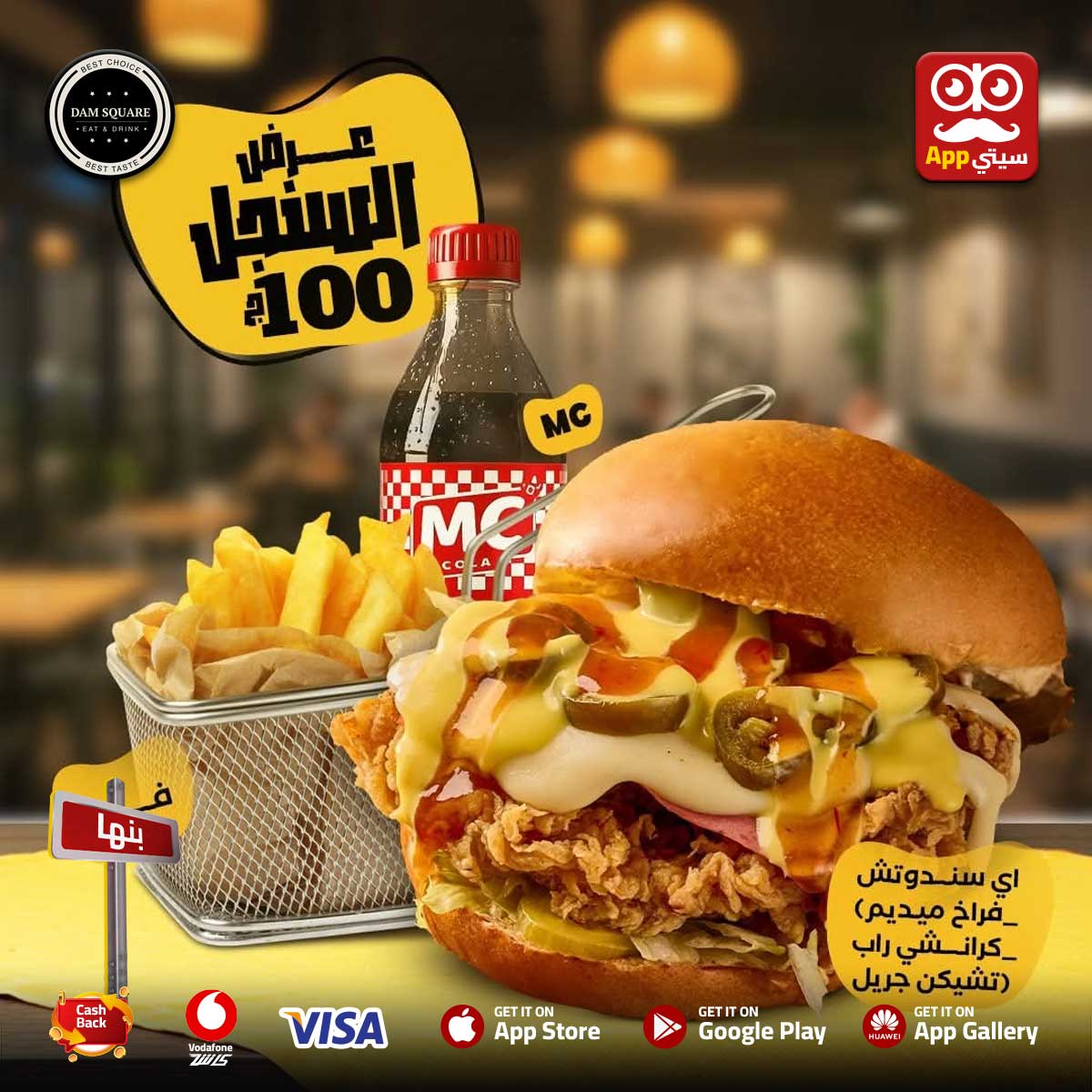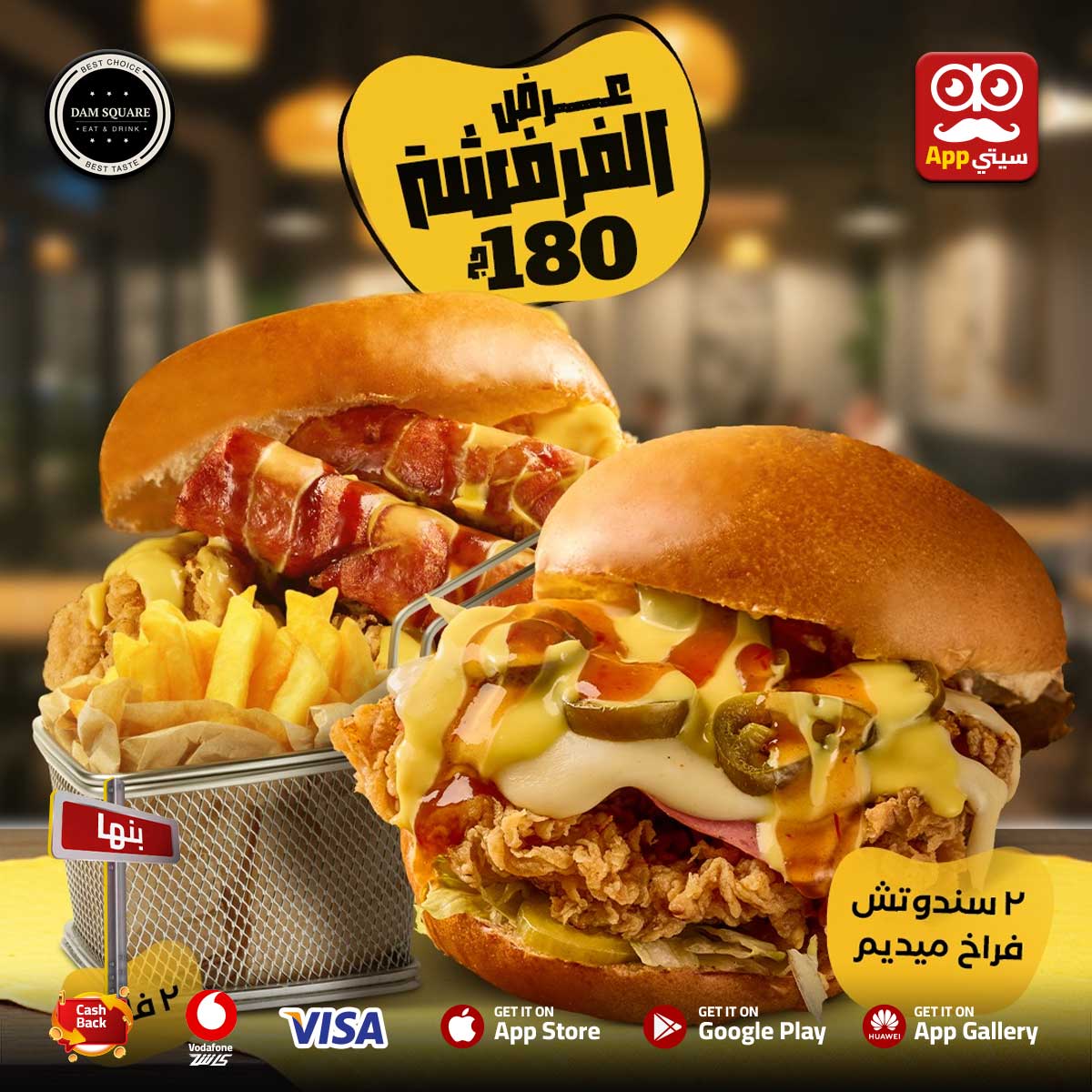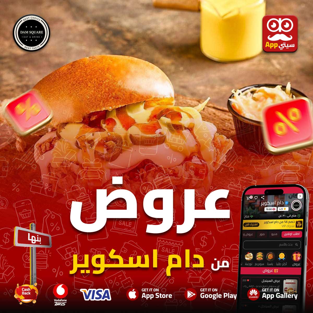 عروووض #دام_اسكوير رجعت من تاني 🎉 🏖️ الصيف مولع و Dam Square عروضها مولعة اكتر على ابلكيشن #سيتي_اب 📱💎 من أول 100 جنيه 💸 أكلك هيبقى مزاج وفرفشة😋 ✨ عرض السينجل بـ 100 ج أي ساندوتش (فراخ ميديم - كرانشي راب - تشيكن جريل) + فارم + مشروب🥤 ✨ مكرونة هوت دوج + مشروب🥤بـ 100 ج 💫 عرض الفرفشة بـ 180 ج 2 ساندوتش فراخ ميديم + 2 فارم 🐔 💫 ( عرض الفرفشة + )بـ 200 ج 2 ساندوتش برجر ميديم + 2 فارم 🍔 💫 عرض البريمو بـ 210 ج 2 ساندوتش فراخ لارج + 2 فارم 🔥 💫 ( عرض البريمو + ) بـ 240 ج 2 ساندوتش برجر لارج + 2 فارم 💥 💫 عرض اللمة بـ 300 ج 3 ساندوتشات فراخ لارج + 3 فارم 👨👩👧👦 💫 ( عرض اللمة + ) بـ 350 ج 3 ساندوتشات برجر لارج + 3 فارم 🧡 💫 عرض الرويال كومبو بـ 170 ج أي وجبة من اختيارك + فارم + رز 🍛 دام سكوير طعم لمة العيله 💖