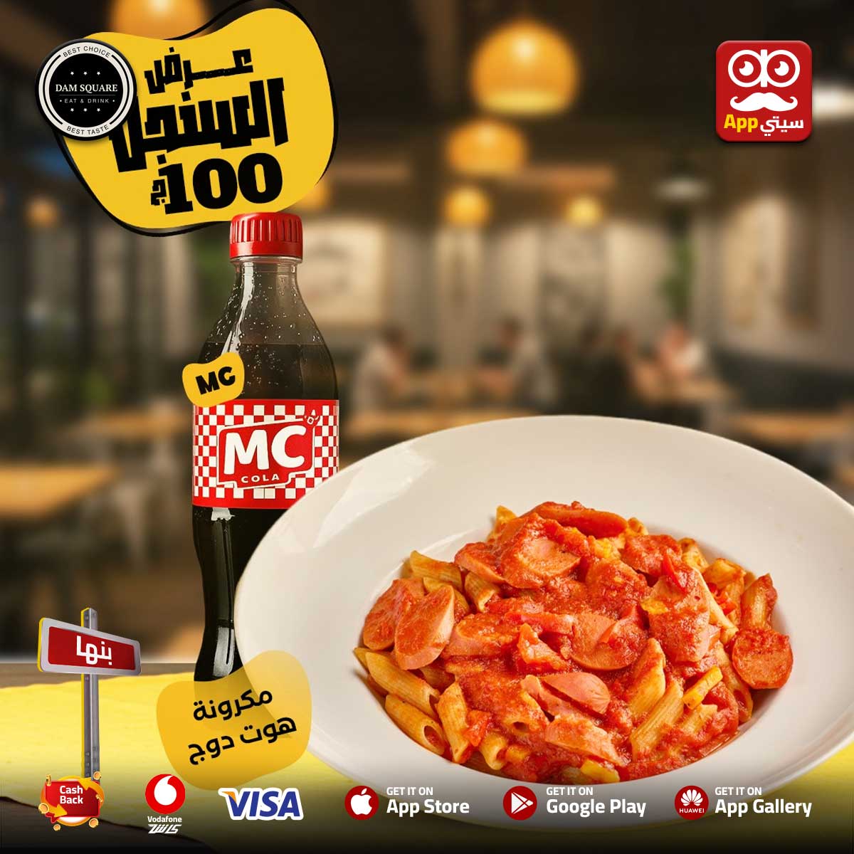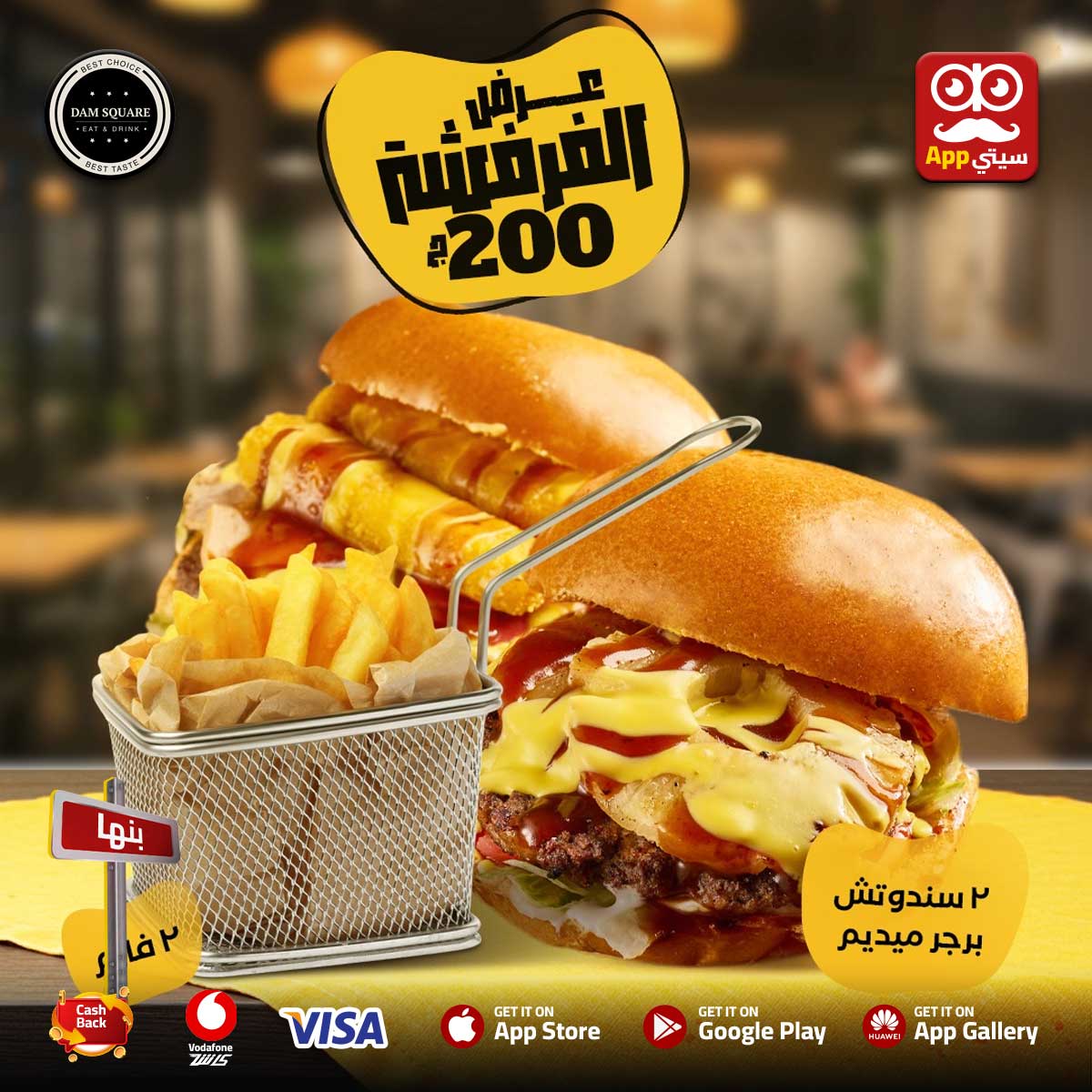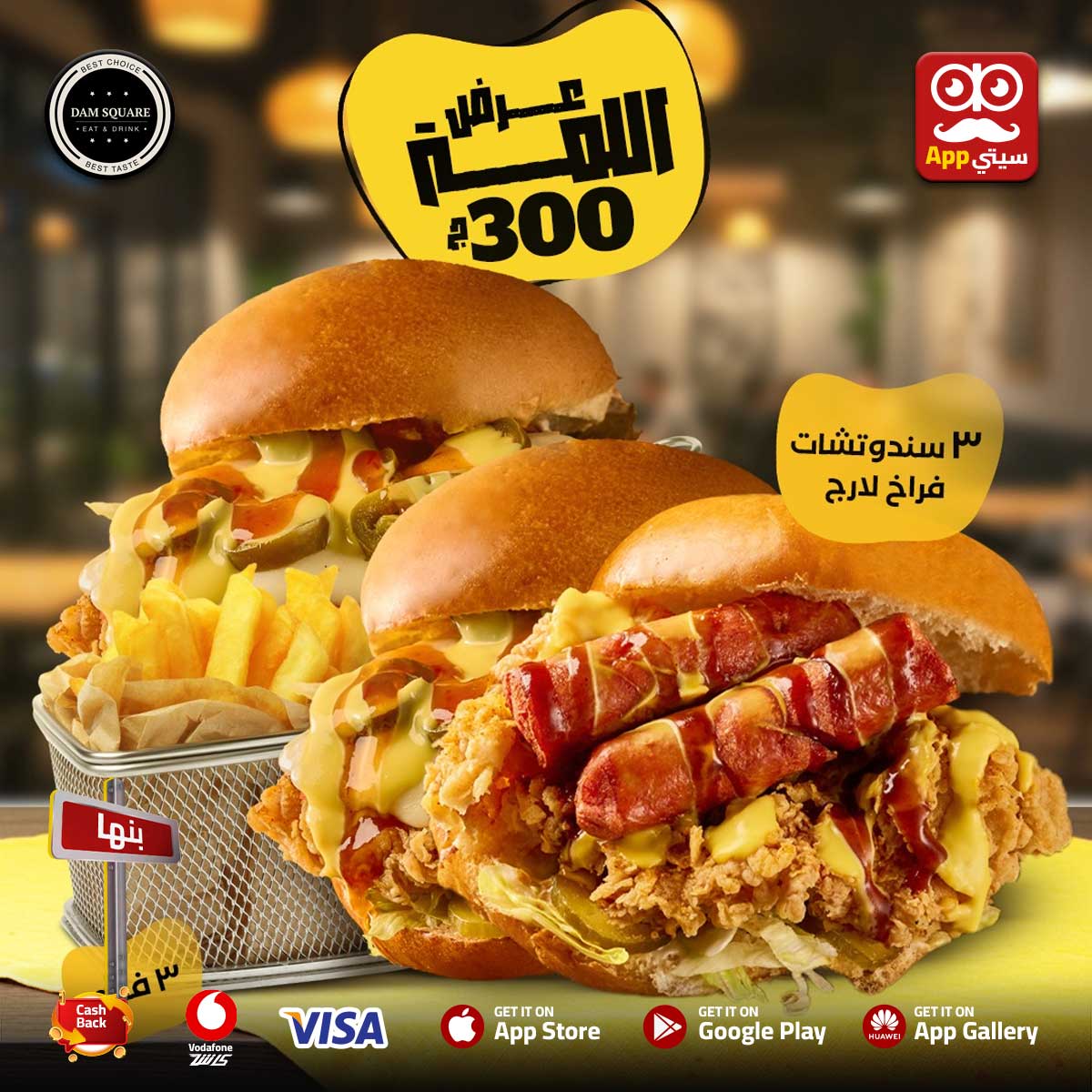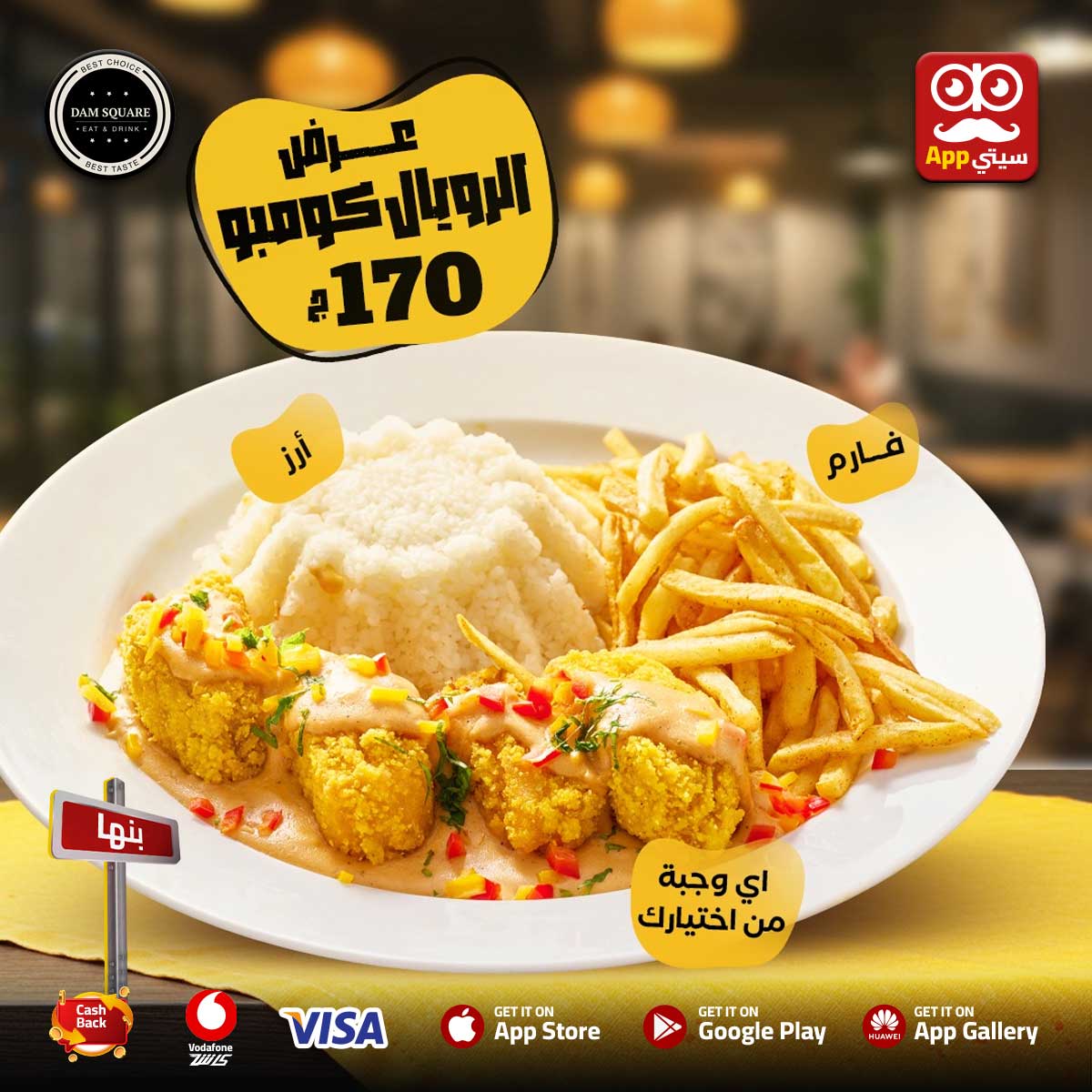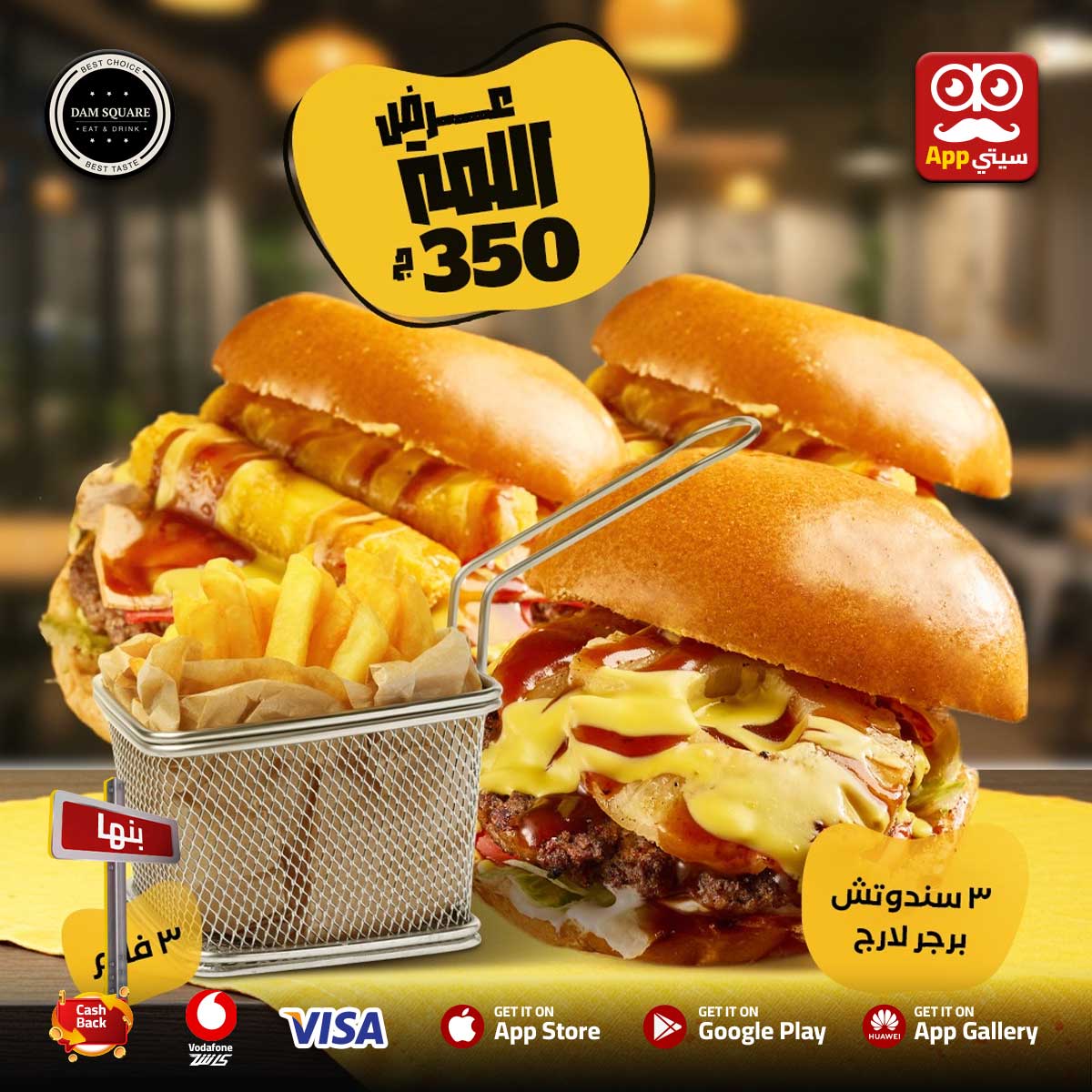 عروووض #دام_اسكوير رجعت من تاني 🎉 🏖️ الصيف مولع و Dam Square عروضها مولعة اكتر على ابلكيشن #سيتي_اب 📱💎 من أول 100 جنيه 💸 أكلك هيبقى مزاج وفرفشة😋 ✨ عرض السينجل بـ 100 ج أي ساندوتش (فراخ ميديم - كرانشي راب - تشيكن جريل) + فارم + مشروب🥤 ✨ مكرونة هوت دوج + مشروب🥤بـ 100 ج 💫 عرض الفرفشة بـ 180 ج 2 ساندوتش فراخ ميديم + 2 فارم 🐔 💫 ( عرض الفرفشة + )بـ 200 ج 2 ساندوتش برجر ميديم + 2 فارم 🍔 💫 عرض البريمو بـ 210 ج 2 ساندوتش فراخ لارج + 2 فارم 🔥 💫 ( عرض البريمو + ) بـ 240 ج 2 ساندوتش برجر لارج + 2 فارم 💥 💫 عرض اللمة بـ 300 ج 3 ساندوتشات فراخ لارج + 3 فارم 👨👩👧👦 💫 ( عرض اللمة + ) بـ 350 ج 3 ساندوتشات برجر لارج + 3 فارم 🧡 💫 عرض الرويال كومبو بـ 170 ج أي وجبة من اختيارك + فارم + رز 🍛 دام سكوير طعم لمة العيله 💖