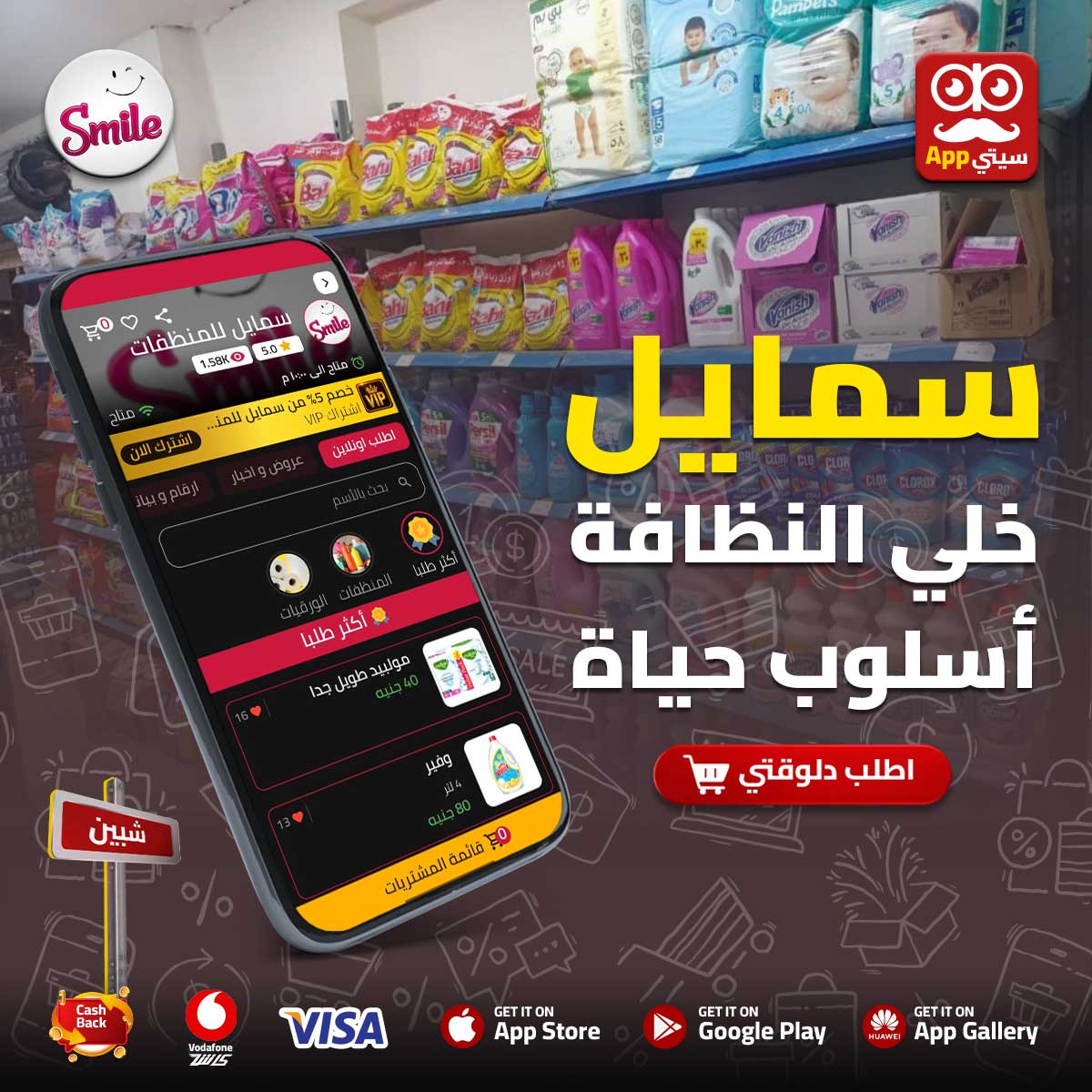 مع #سمايل خلي النظافة أسلوب حياة ✨🧼 في #شبين على ابلكيشن #سيتي_اب 📱💎 موجود في قسم " طلبات البيت " 🛒🤎 النظافة مش رفاهية دي راحة بال وصحة ليكي ولعيلتك 💛 وعشان كده سمايل للمنظفات جمّعلك كل اللي تحتاجيه في مكان واحد 🧽 منظفات منزلية قوية ✨ 🧼 مطهرات ومعقمات👌 👕 منتجات غسيل وعناية بالملابس 🌸 🚿 منتجات عناية شخصية 💧 مع #سمايل النظافة مش مجرد عادة، دي أسلوب حياة 🌿