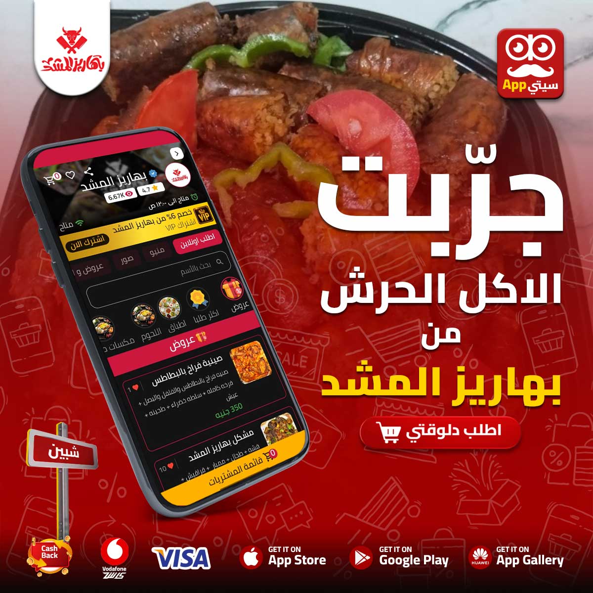 جربت الاكل الحرش من #بهاريز_المشد ؟🔥 فـ #شبين ع ابلكيشن #سيتي_اب 📱💎 فتة وشوربة وساندوتشات 🥘🌯 لحمة وكوارع وكبدة وسجق وممبار وكمان طواجن ورغيف طلب مشكل ولا أجدعها عزومة 😋✨ إنت بس اطلب دلوقتي وخلي بهاريز المشد يظبطلك المزاج 👌
