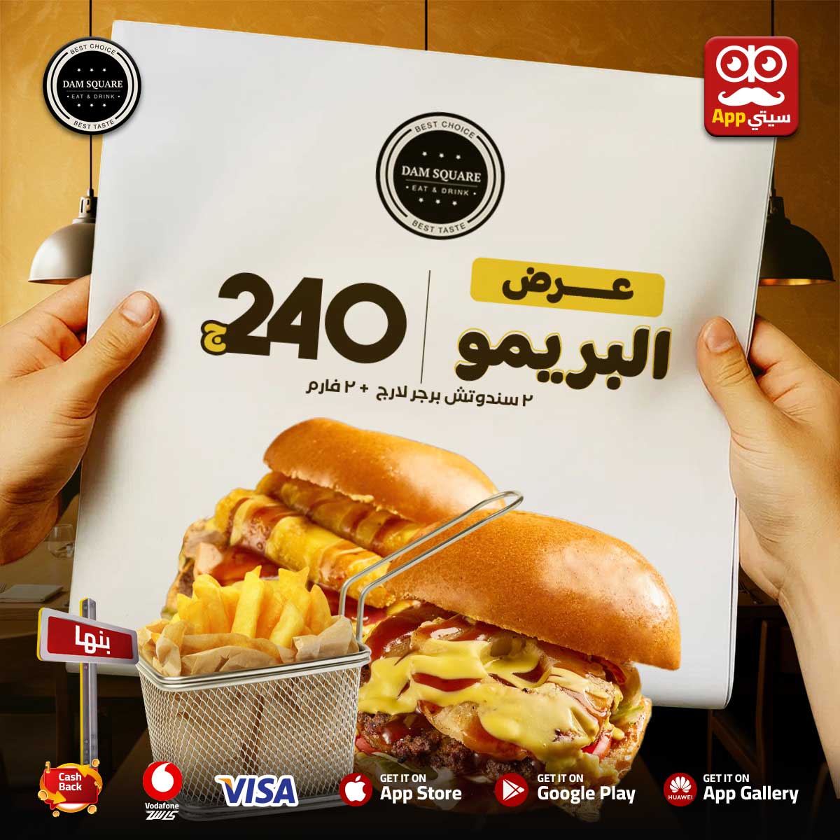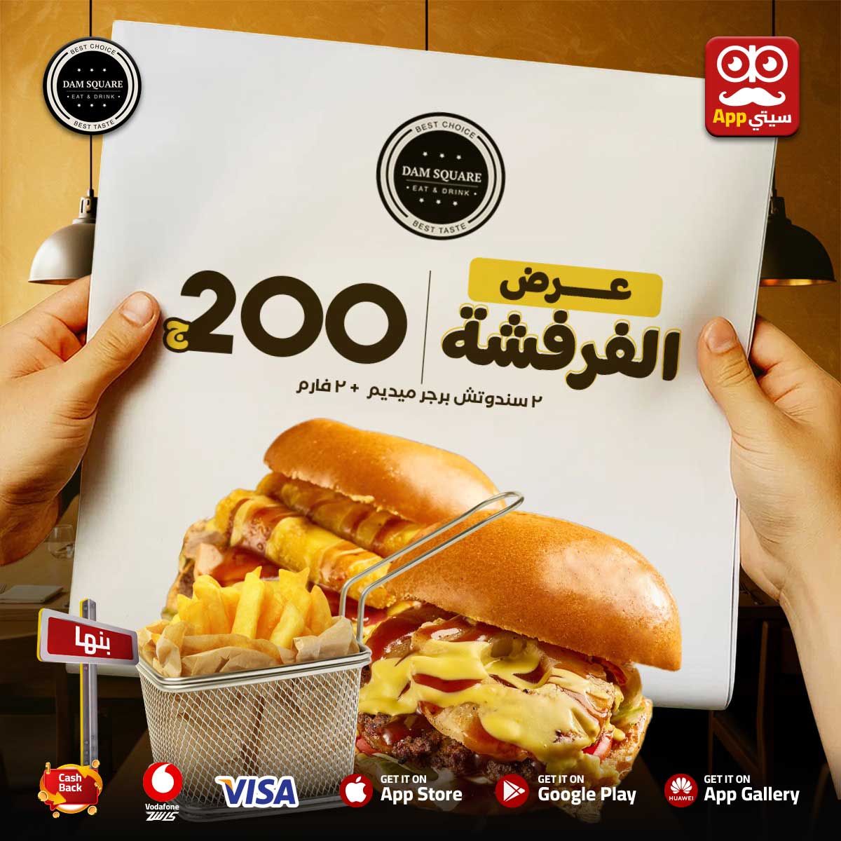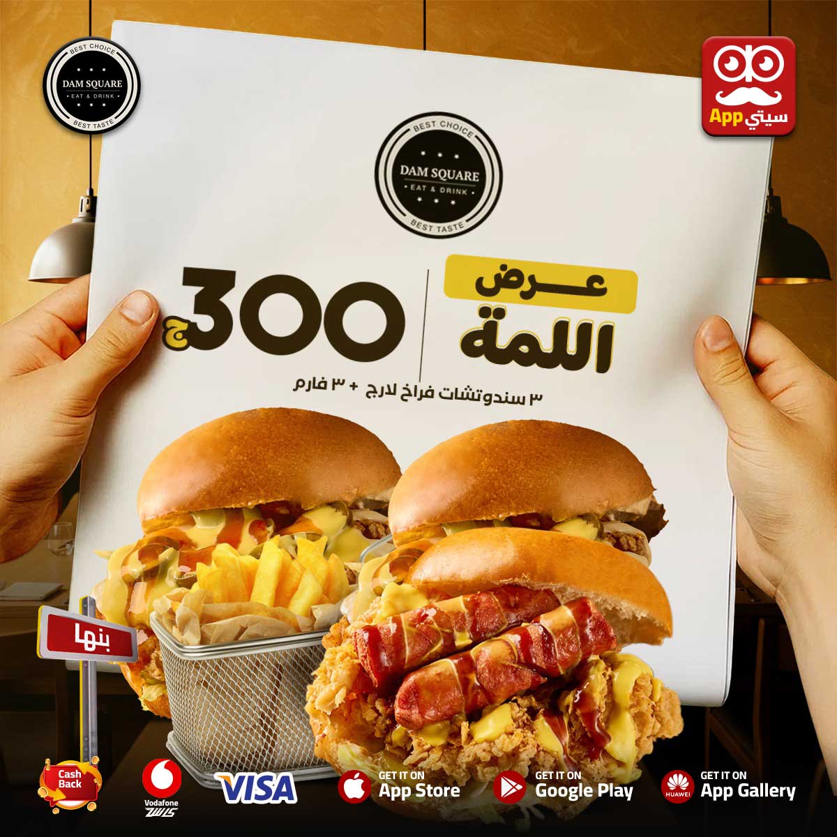 أقوي عروض في #بنها بأسعار تبدأ من 100ج 🔥 لوحدك أو مع أصحابك هتلاقي أقوي عروض من #دام_سكوير ع ابلكيشن #سيتي_اب 📱💎 ✨ عرض السينجل بـ 100 ج أي ساندوتش (فراخ ميديم - كرانشي راب - تشيكن جريل) + فارم + مشروب🥤 ✨ مكرونة هوت دوج + مشروب🥤بـ 100 ج 💫 عرض الرويال كومبو بـ 170 ج أي وجبة من اختيارك + فارم + رز 🍛 💫 عرض الفرفشة بـ 180 ج 2 ساندوتش فراخ ميديم + 2 فارم 🐔 💫 ( عرض الفرفشة + )بـ 200 ج 2 ساندوتش برجر ميديم + 2 فارم 🍔 💫 عرض البريمو بـ 210 ج 2 ساندوتش فراخ لارج + 2 فارم 🔥 💫 ( عرض البريمو + ) بـ 240 ج 2 ساندوتش برجر لارج + 2 فارم 💥 💫 عرض اللمة بـ 300 ج 3 ساندوتشات فراخ لارج + 3 فارم 👨👩👧👦 💫 ( عرض اللمة + ) بـ 350 ج 3 ساندوتشات برجر لارج + 3 فارم 🧡 دام سكوير طعم لمة العيله 💖