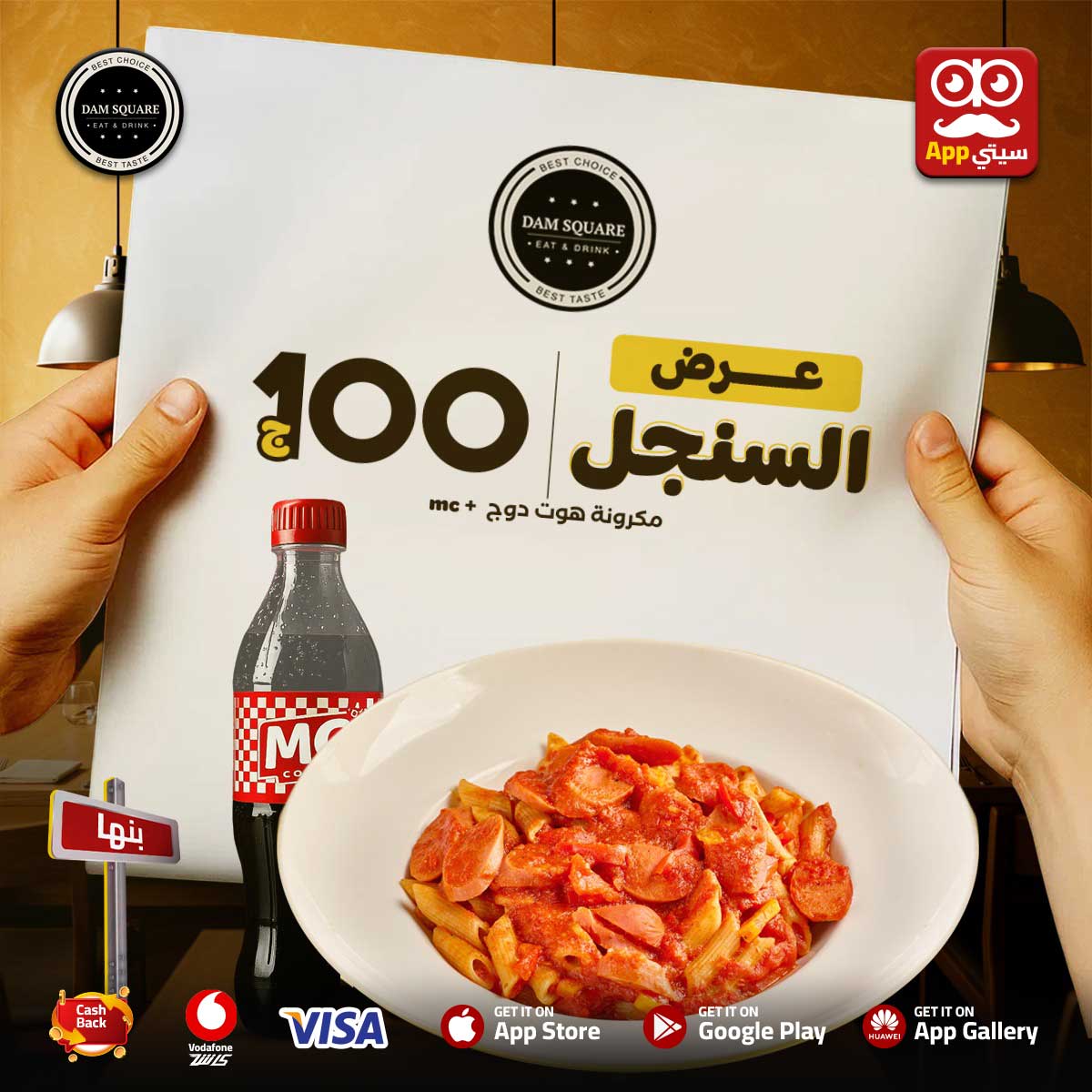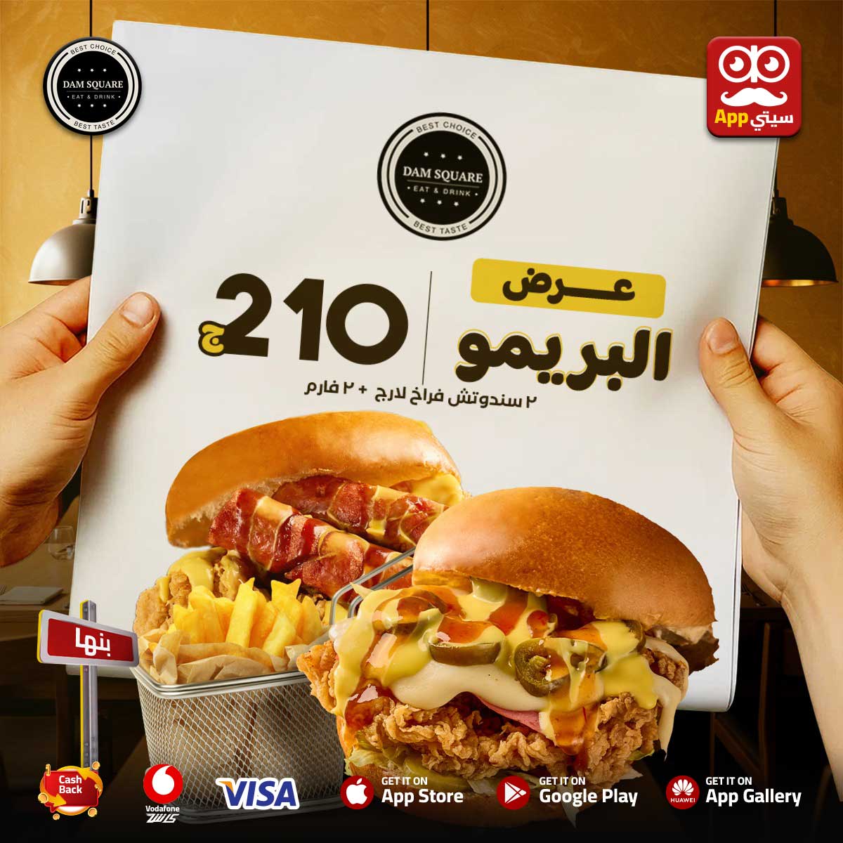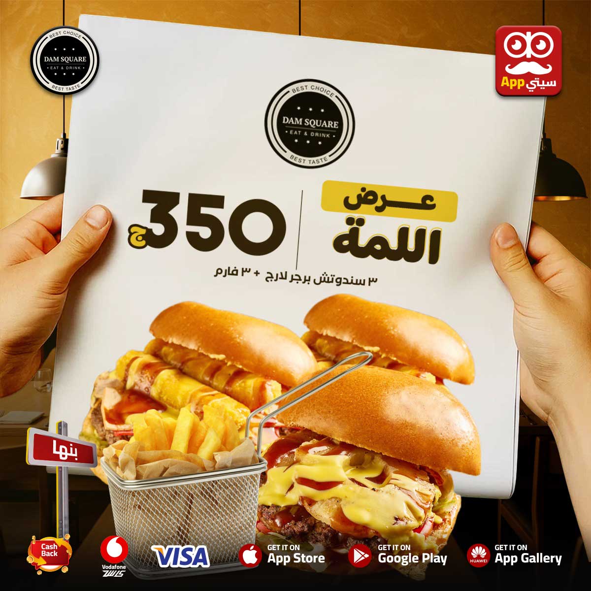 أقوي عروض في #بنها بأسعار تبدأ من 100ج 🔥 لوحدك أو مع أصحابك هتلاقي أقوي عروض من #دام_سكوير ع ابلكيشن #سيتي_اب 📱💎 ✨ عرض السينجل بـ 100 ج أي ساندوتش (فراخ ميديم - كرانشي راب - تشيكن جريل) + فارم + مشروب🥤 ✨ مكرونة هوت دوج + مشروب🥤بـ 100 ج 💫 عرض الرويال كومبو بـ 170 ج أي وجبة من اختيارك + فارم + رز 🍛 💫 عرض الفرفشة بـ 180 ج 2 ساندوتش فراخ ميديم + 2 فارم 🐔 💫 ( عرض الفرفشة + )بـ 200 ج 2 ساندوتش برجر ميديم + 2 فارم 🍔 💫 عرض البريمو بـ 210 ج 2 ساندوتش فراخ لارج + 2 فارم 🔥 💫 ( عرض البريمو + ) بـ 240 ج 2 ساندوتش برجر لارج + 2 فارم 💥 💫 عرض اللمة بـ 300 ج 3 ساندوتشات فراخ لارج + 3 فارم 👨👩👧👦 💫 ( عرض اللمة + ) بـ 350 ج 3 ساندوتشات برجر لارج + 3 فارم 🧡 دام سكوير طعم لمة العيله 💖