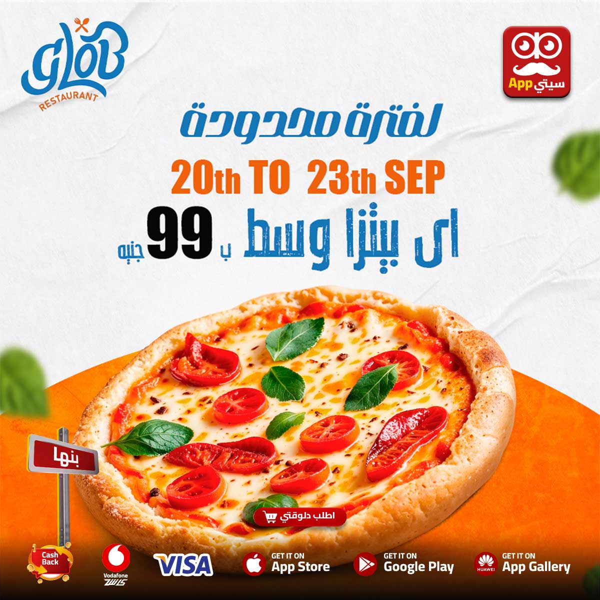 أي بيتزا وسط بـ 99 جنيه 💸 😍 عرض ميتفوتش من #جلوب ع البيتزا 🍕🔥 فـ #بنها على ابلكيشن #سيتي_اب 📱💎 العرض لفتره محدوده 4 أيام بس ⏳ كل الأذواق هتلاقي اللي بيروق عليها 😉