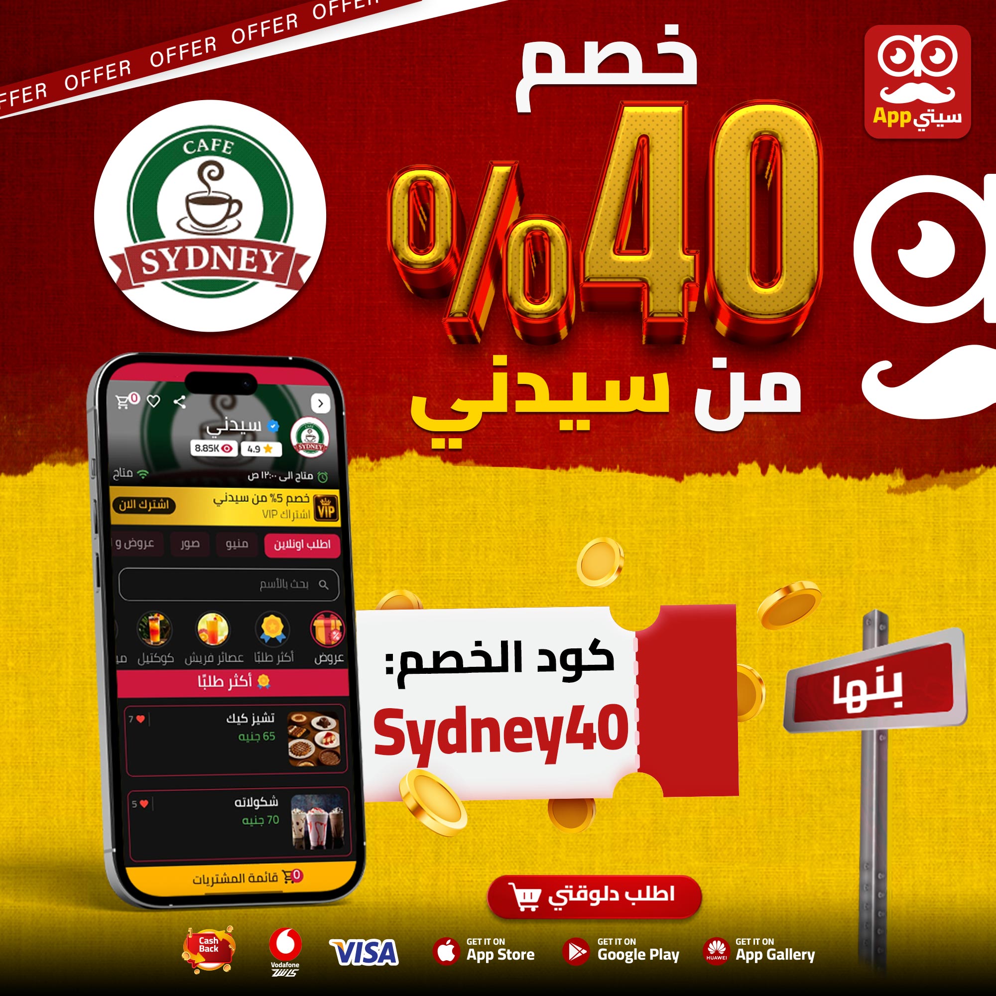 خصم 40% ع المنيو كله من #سيدني ☕🍰 وده أكبر خصم ممكن تستغله دلوقتي 😍🔥 استخدم كود الخصم " Sydney40 " 🎁 واستمتع بقهوتك المفضلة، الحلويات والسناكس كلها بنص السعر تقريبًا 🙈💸 سواء رايح تذاكر، تشتغل أو حتى تقعد قعدة رايقة مع صحابك ✨ الحق العرض قبل ما يخلص لأن الخصم الكبير ده مش كل يوم 💥