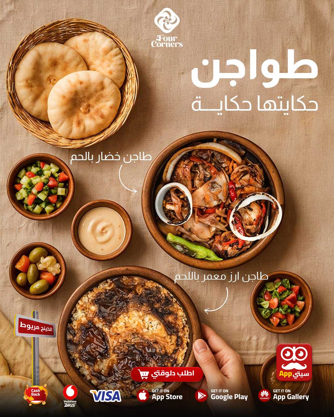 أكتوبر دخل والجو بدأ يبرد، يبقي مفيش أحسن من طاجن سخن يدفيك 🍲🔥 عند #فور_كورنر فـ #كينج_مريوط ع ابلكيشن #سيتي_اب 📱 هتلاقي طواجن حكايتها حكاية من أول الريحة لحد آخر لقمة 😋❤️