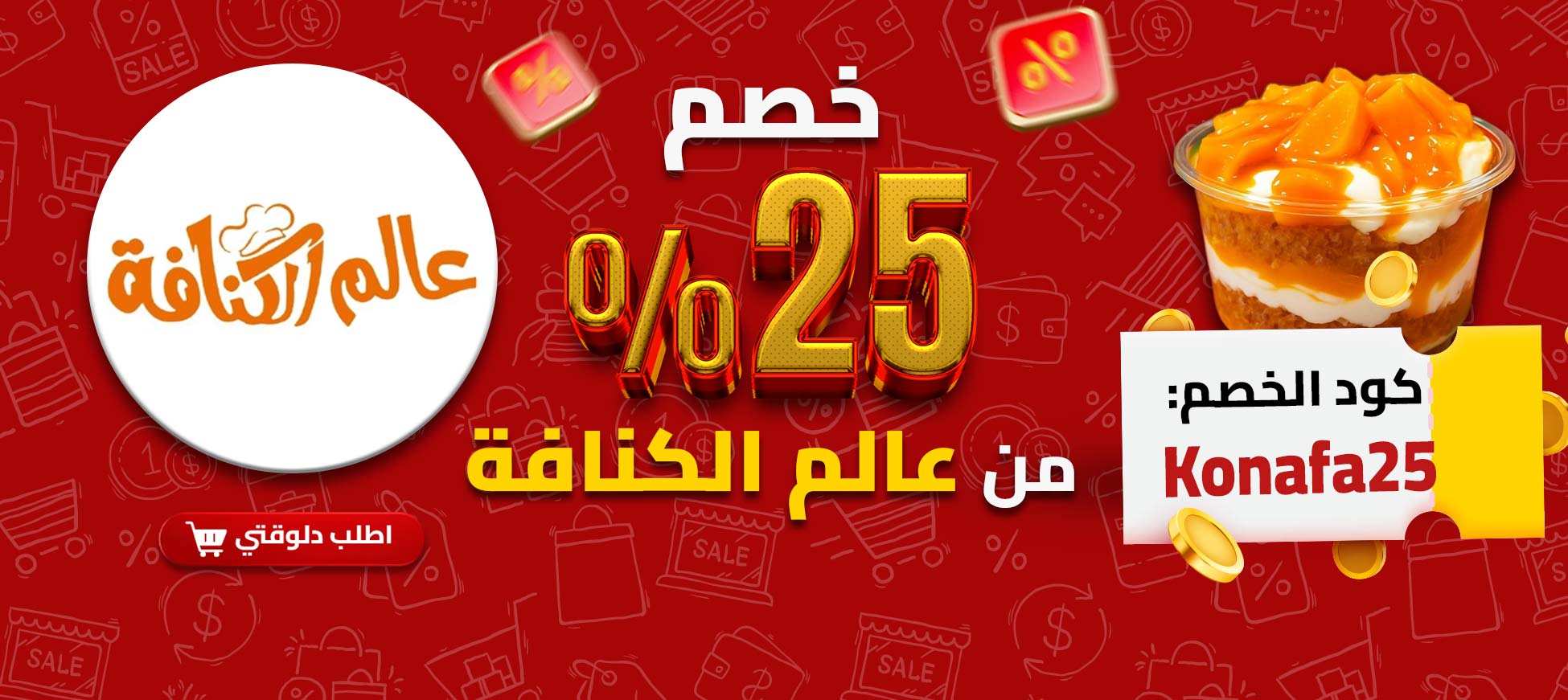 #خصم 25% من #عالم_الكنافة ع المنيو كله 🎉 لما تستخدم كود الخصم " Konafa25 " 🎁 اللي بيقول السعادة ملهاش طعم واضح إنه مجربش الكنافة من عالم الكنافة 🍰💛 يعني هتاكل كنافة، بسبوسة وقطع من السعادة 😋 دلع نفسك بحاجه حلوة على مزاجك واطلب دلوقتي قبل العرض ما يطير 😉✨