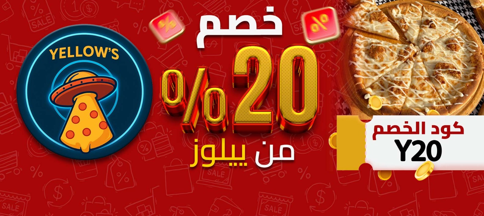 #خصم 20% ع المنيو كله من #يلوز 👽🛸 لما تستخدم كود الخصم " Y20 " 🎁 جرب البيتزا، الباستا، الطواجن وبطاطس يلوز اللي جاية من مجرة تانية 🪐🔥 استعد للإقلاع مع يلوز Yellow's 🚀✨ وخلي الطعم يخطفك لكوكب تاني 💛🌍