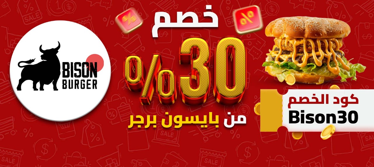 #خصم 30% ع منيو #بايسون_برجر كله 🤯🔥 لما تستخدم كود الخصم " Bison30 " 🎁 ودي دعوة رسمية تدلع نفسك بيها ع الاخر 🍔😋 اللحم طري، العيش فريش، والصوصات؟ بتدخل القلب من غير استئذان ❤️🔥 جاهز تبسط بطنك؟ اطلب دلوقتي وخلي بايسون يحلي يومك ✨🍔🐃