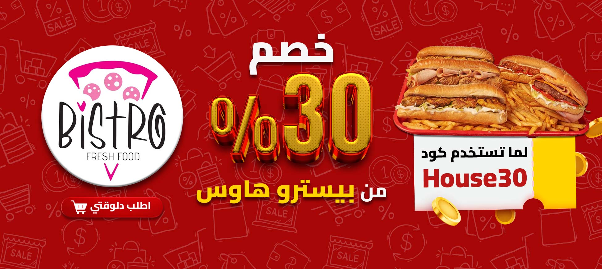 خصم 30% من #بيسترو_هاوس 🔥 لما تستخدم كود الخصم House30 🎁 استمتع بوجبات تشبع 🍗 ساندوتشات طازة 🥪 بيتزا مليانة جبنة 🍕 وباستا هتعجبك من أول لقمة 🍝 الخصم موجود… وأنت بس اللي محتاج تقرر هتطلب إيه الأول 😋 اطلب وخلي بيسترو هاوس يظبطلك اليوم 👌