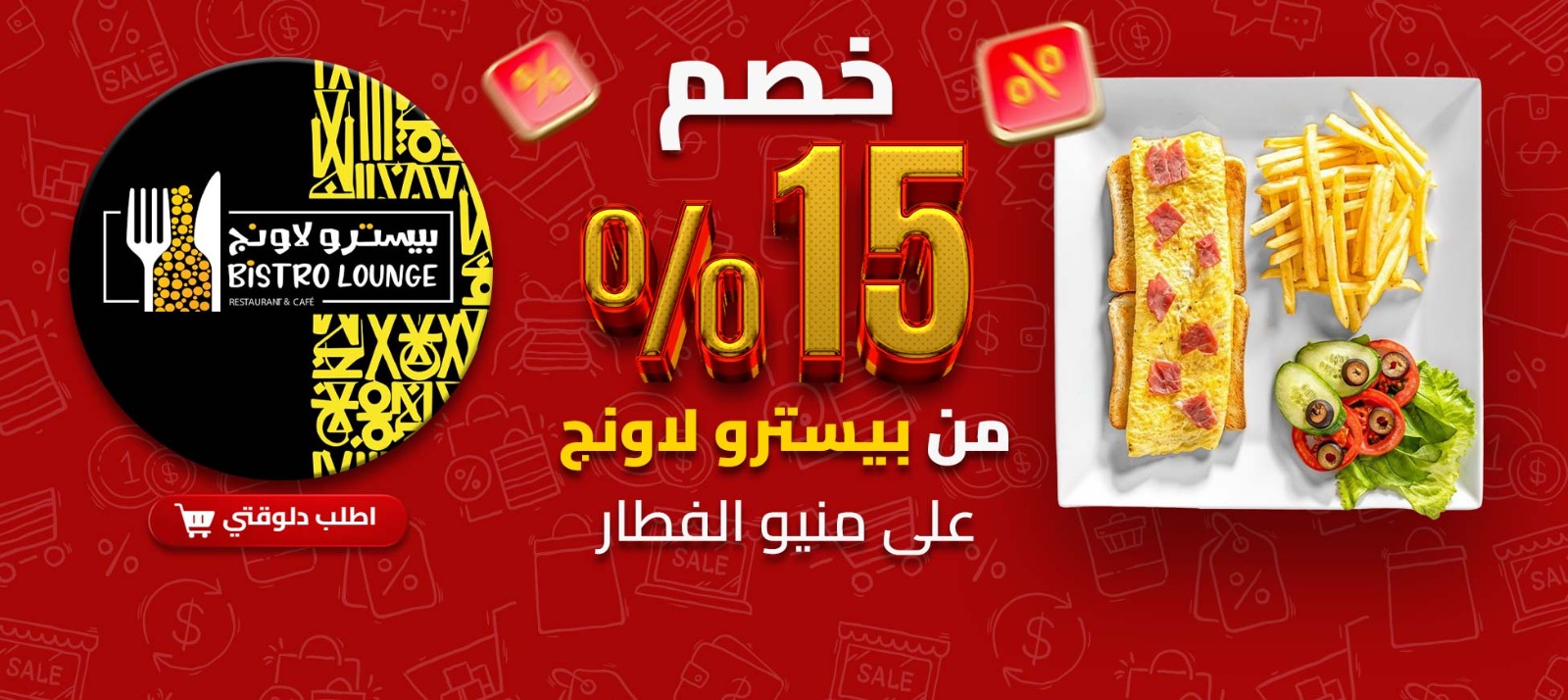 خصم 15٪ ع منيو الفطار من #بيسترو_لاونج 🔥 فطار مصري أصيل او فطير وعسل🥞 أو فطار مختلف يكسر الروتين 😋 فطار متنوع يخليك تبدأ يومك بابتسامة ✨