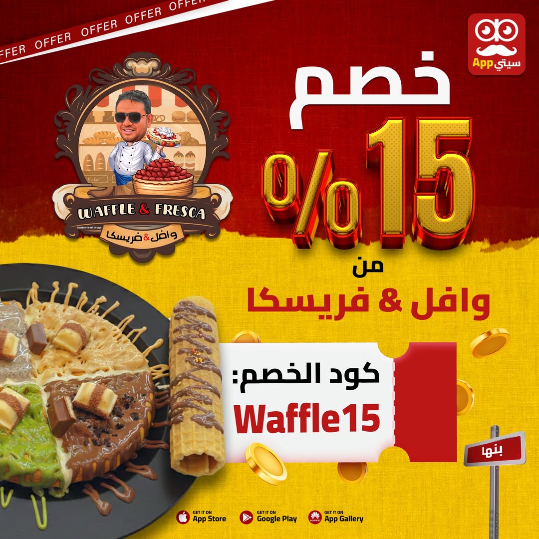 خصم 15% علي المنيو كله من وافل & فريسكا لما تستخدم كود الخصم "Waffle15" وافل ,كريب ,بان كيك وحاجات مختلفة كتير😍 اختار بين النوتيلا، الكراميل، الفراولة أو اللوتس ودلع نفسك بحاجة تحبها 😋