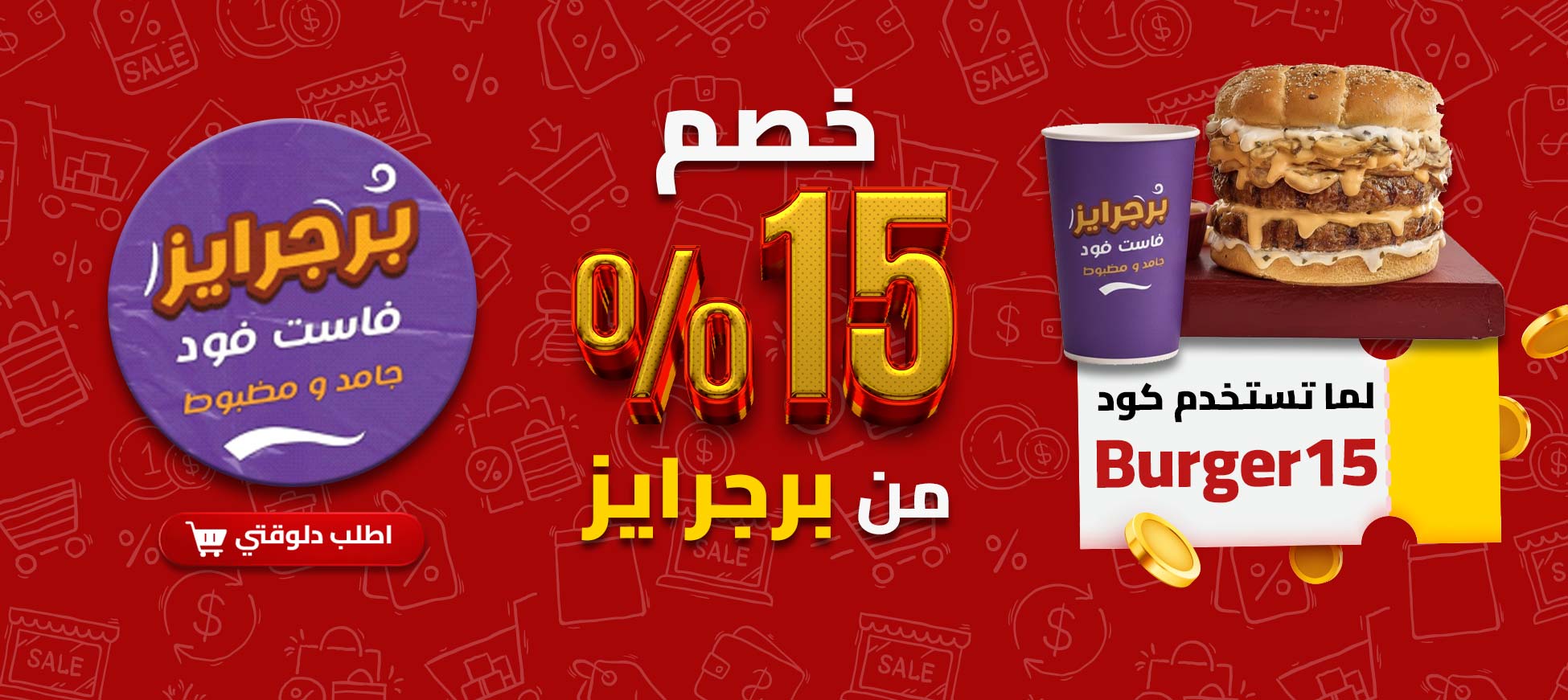 خصم 15% ع المنيو كله من #برجرايز 🔥 لما تستخدم كود الخصم "Burger15" 🎁 اطلب دلوقتي وهتدوق أحلى سماش برجر 🍔 ودلع كتير مشوفتوش قبل كدا 😋💥 سواء جعان على الآخر أو عايز دلع مزاج برجرايز جاهز يظبطها معاك 💥👌